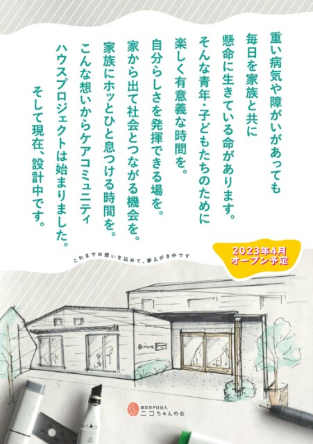 出会う機会を作る 2024.01.302023.07.13 活動のこと 団体のこと採用のこと福祉サービスのこと支援のことアーカイブお問い合わせ 活動のこと 誰でも同じように楽しめるイベントを企画しています。日ごろなかなか出会わない人、接し方がわからない人同士が出会うことで、互いの距離を縮められたらと考えています。 【ご報告】落成式&オープンデー 2023.10.03 移転・オープンデーのおしらせ 2023.06.19 【2023/5/13 朝日新聞】ケアコミュニティハウス ニコちゃん家 2023.05.23 上棟式 2023.03.28 地鎮祭 2022.12.122022.12.13 ケアコミュニティハウスにご支援お願いします 2022.10.202023.03.22 もっと詳しく もっと詳しく