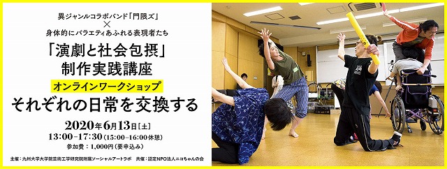 支援/被支援の境界を越えて気づきを生み、参加者が自身の活動に活かしていただくことを目指してきた「演劇と社会包摂」制作実践講座。6月に実施したオンラインワークショップの第2弾を開催します。異ジャンルコラボバンド「門限ズ」や、福岡を拠点に活躍する障がいのある俳優たちと、それぞれの日常を交換することから、奇想天外な表現が立ち上がる瞬間を、ともに体感する場をひらきます。
